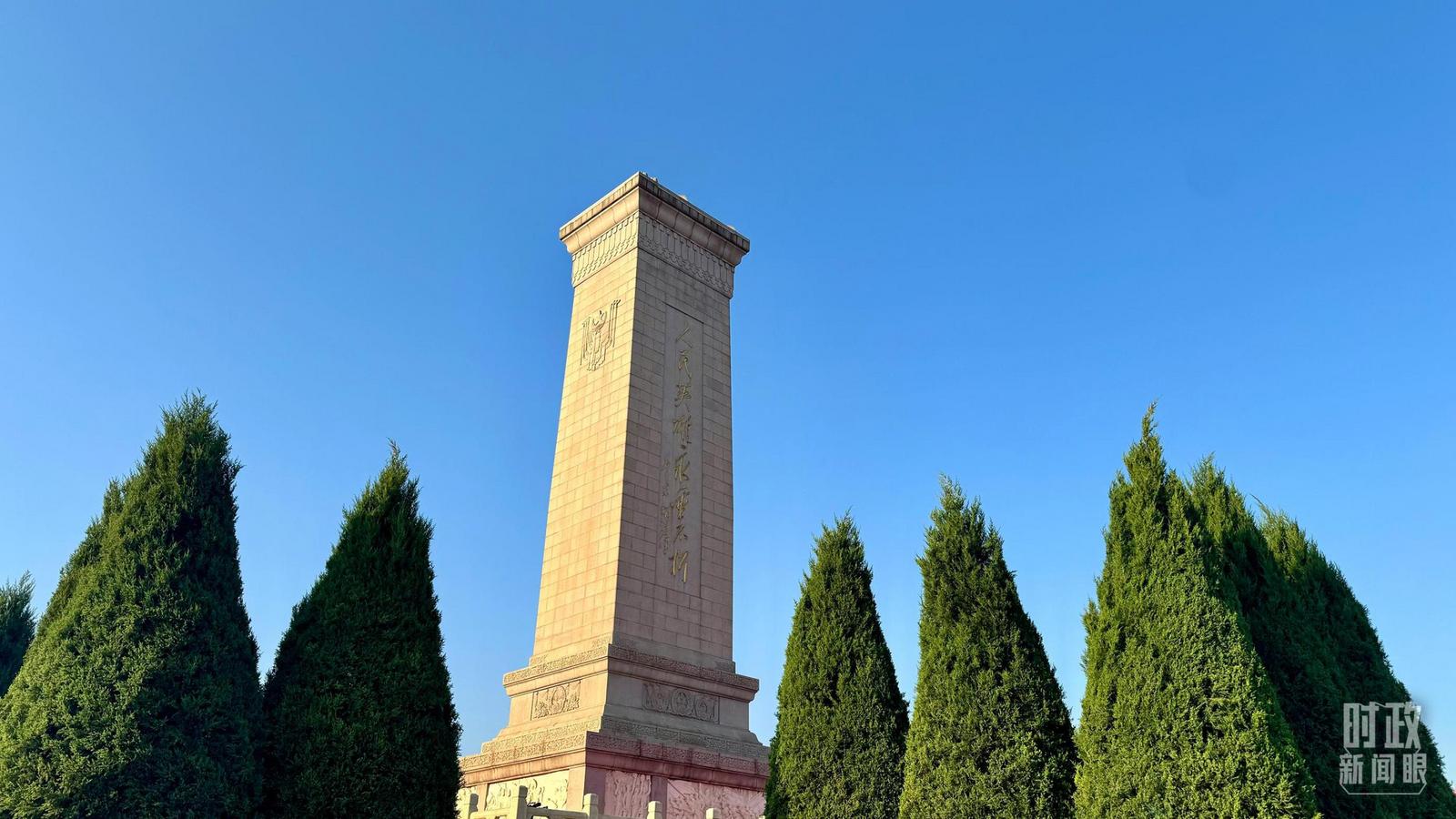 天安门广场上,人民英雄纪念碑前,红旗猎猎。白菊等鲜花组成的18个花环摆放在纪念碑北侧。深沉悠远的烈士纪念日号角表达对英烈的深情追思。