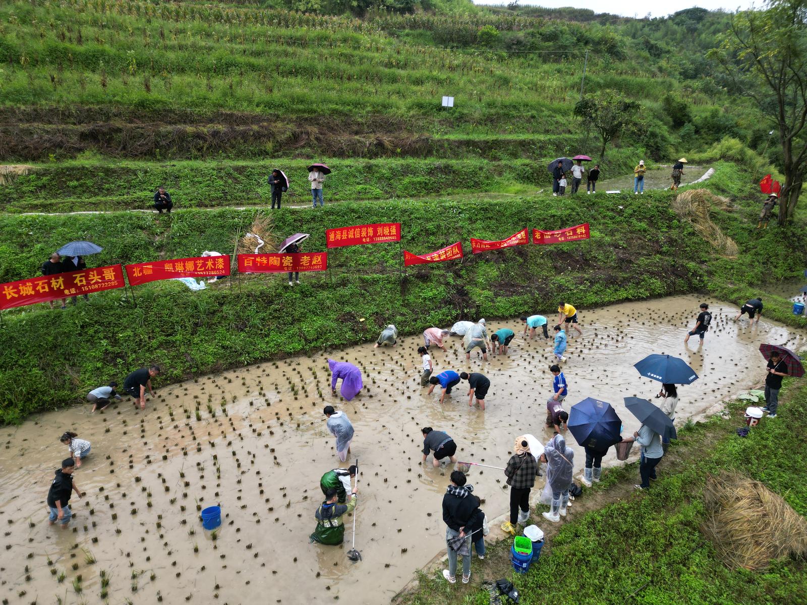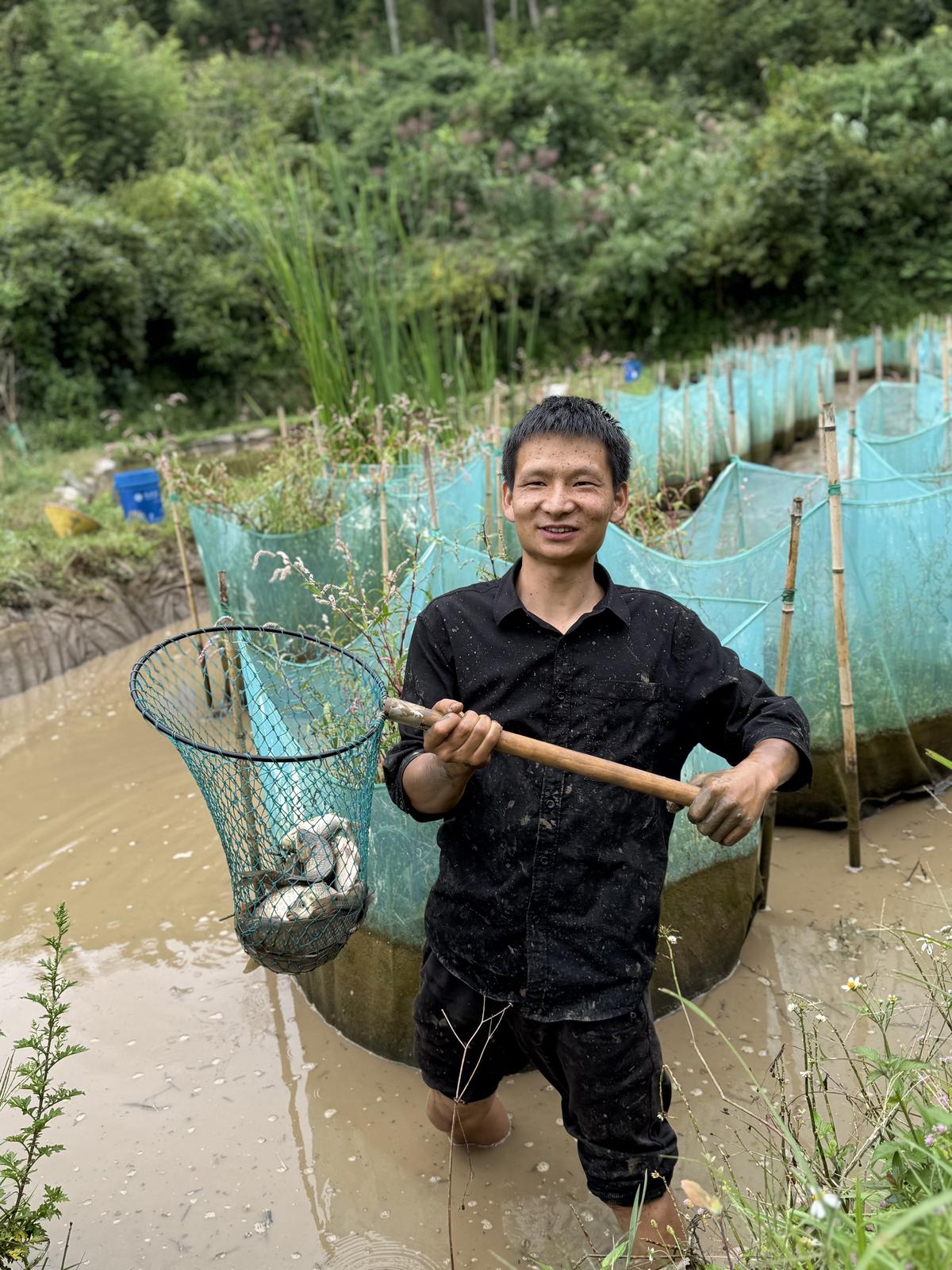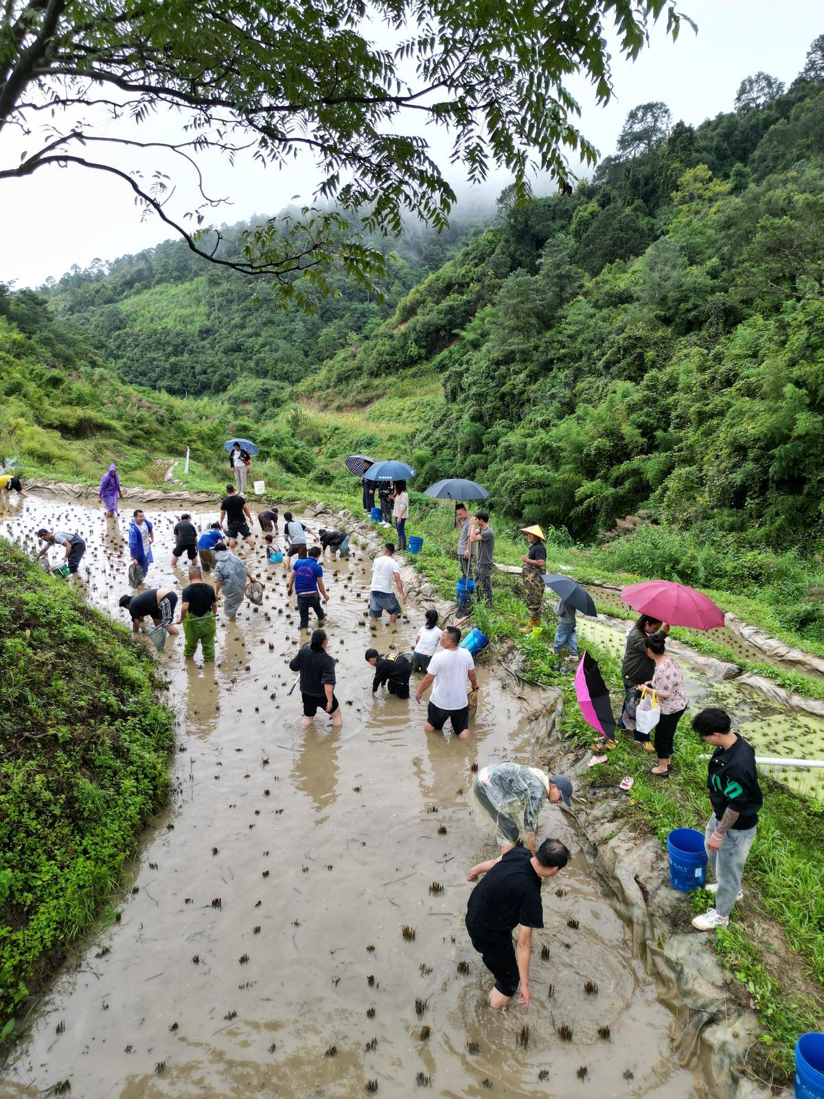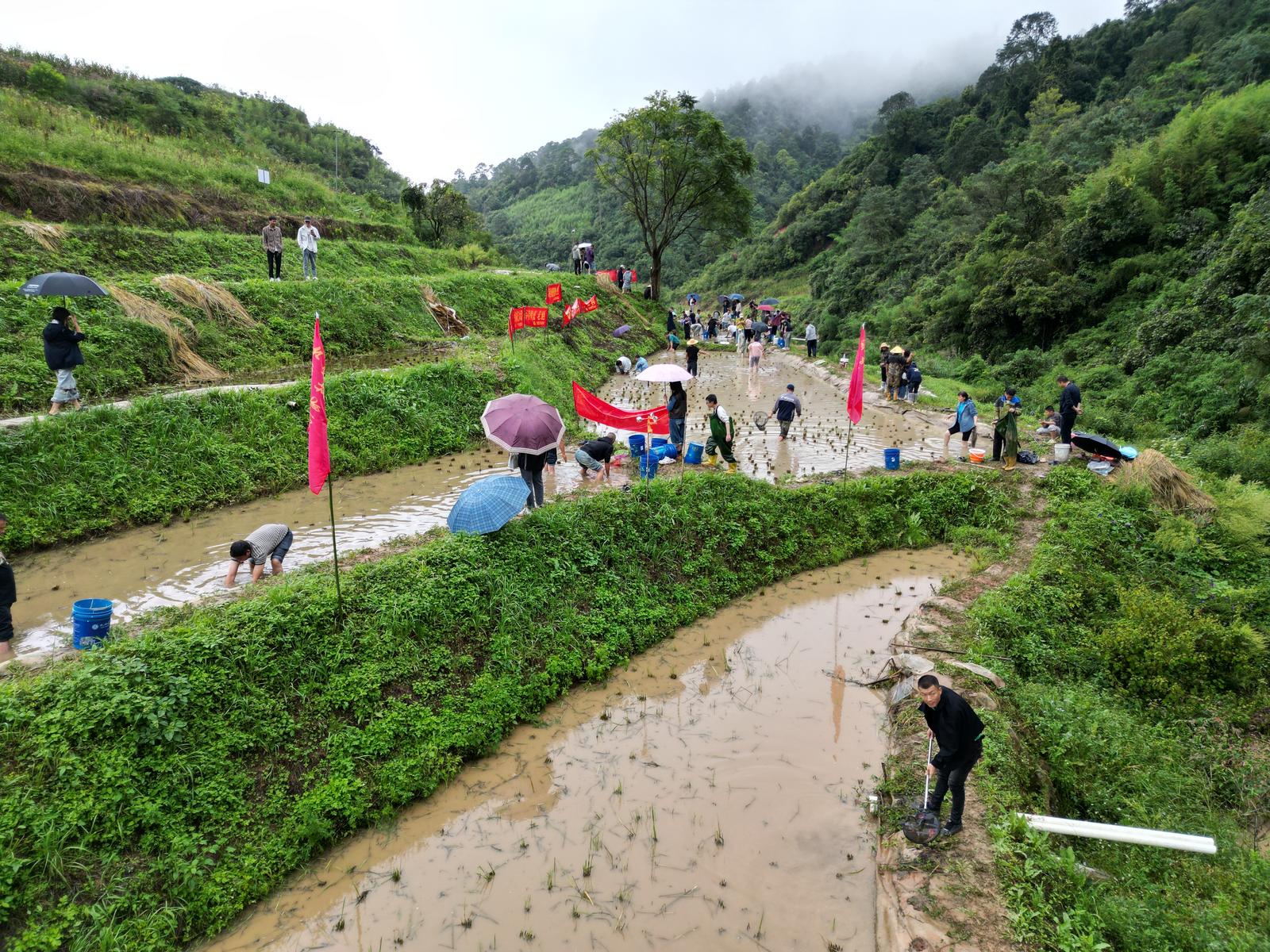 国庆节当天,里山乡中铺生态种养殖基地一派热闹景象。远处青山巍峨矗立,近处绿水蜿蜒环绕,连片阶梯式稻田与自然景致相映成趣,一场充满野趣的摸鱼节在此拉开帷幕。
