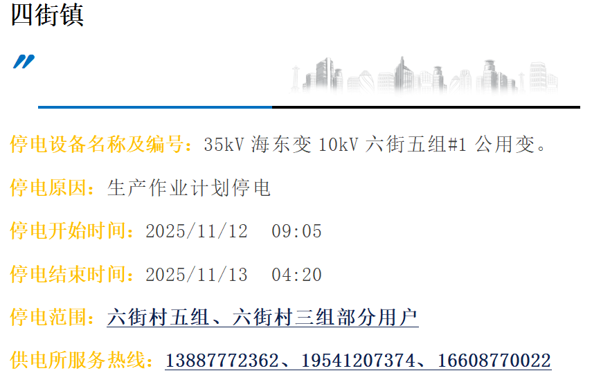 下列为计划停电时间,如有特殊原因有变动的可能,为确保您的安全,所有设备均视为带电运行,请您与电力设备保持足够的安全距离。若您有检修或需办理用电业务等工作需要配合,请您提前三天到我局有关部门办理停复电手续。因计划停电工作给您带来不便表示歉意,感谢您的理解与支持,若有疑问敬请拨打当地供电所服务热线。