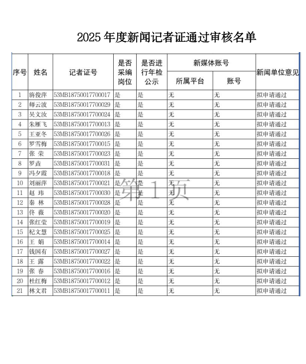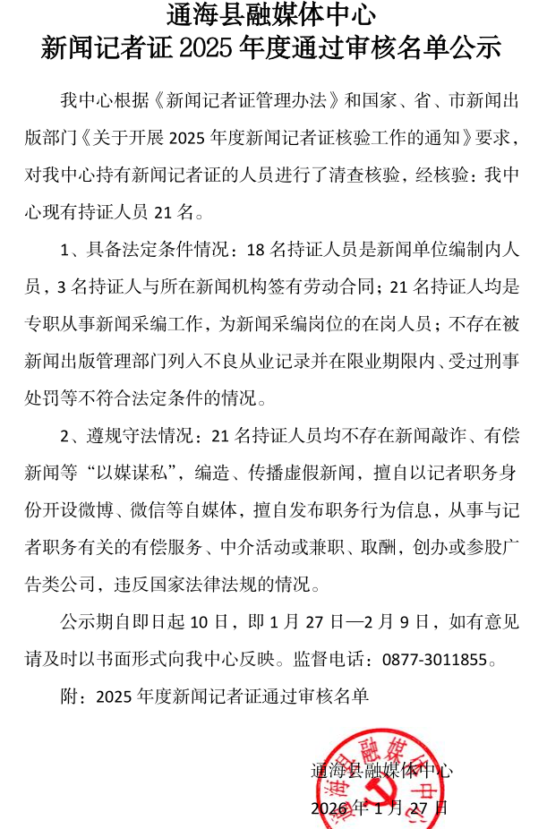 通海县融媒体中心新闻记者证2025年度通过审核名单公示