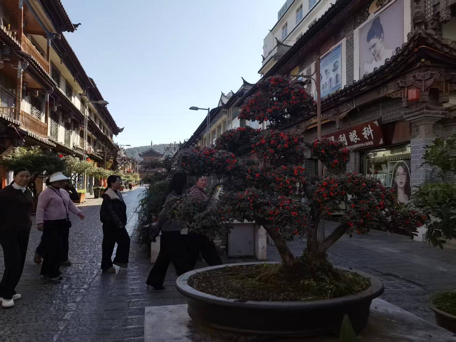 行走在通海古城,小桥流水潺潺,一盆盆梅花盆景竞相吐蕊,白似凝霜、红若燃霞,与青石板路、飞檐黛瓦相融相生;艳红喜庆的杜鹃花、荀子盆景错落点缀,将小城装点得灵动多姿,一步一景皆是雅致。
