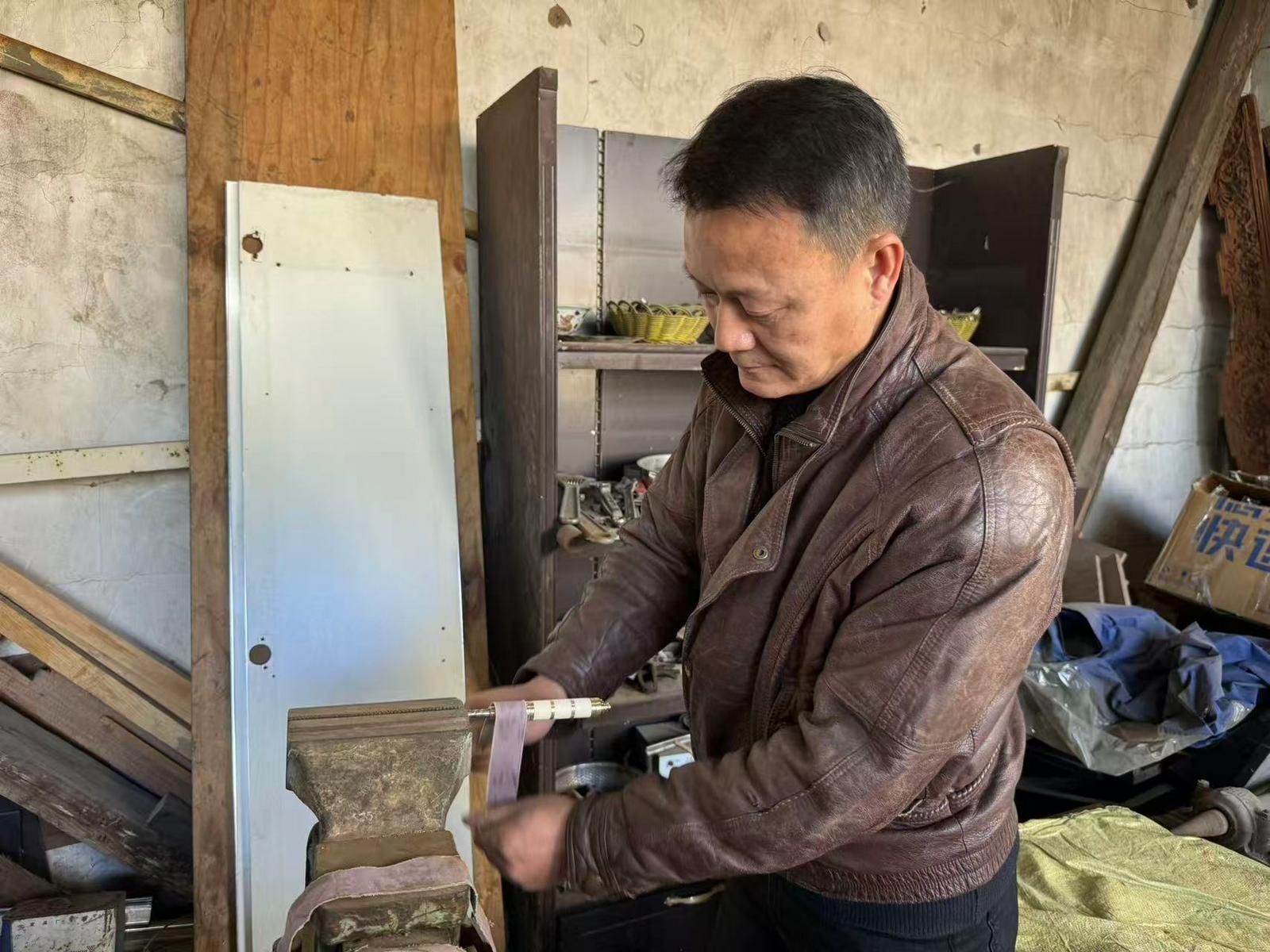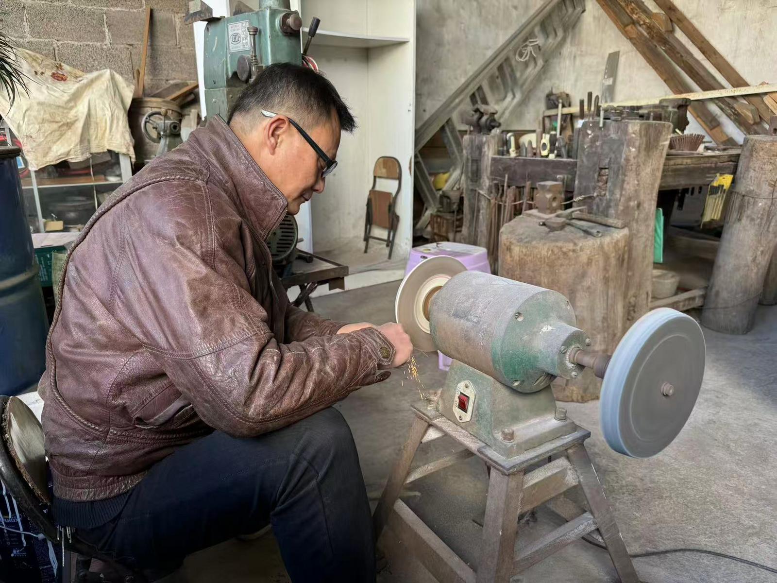 在纳古镇古雅小筑金属工艺工作室,古朴的木砧手工台静静摆放。非遗传承人纳航章正专注打磨茶刀,坯料在砂轮上精细加工,金属碎屑簌簌落下,每一个动作都沉稳专注。