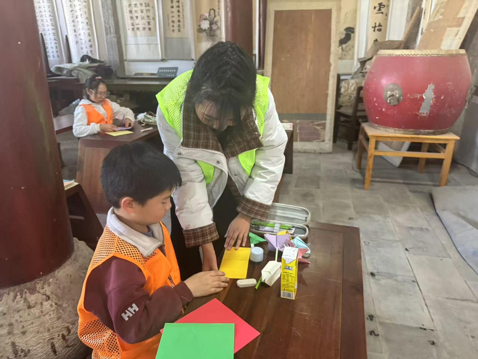 进托管班,欢声笑语扑面而来,手工课堂上,返乡大学生志愿者化身贴心“手工导师”,全程陪伴在孩子们身边,助力他们解锁指尖上的创意与美好。志愿者们提前精心备好彩纸等材料,耐心细致地现场示范操作流程,手把手指导孩子们动手实践,不多时,一朵朵色彩鲜艳、造型可爱的折纸花相继诞生,孩子们高高举着自己的得意作品,相互欣赏、分享喜悦,课堂的每一个角落,满满都是童年的欢乐与美好。
