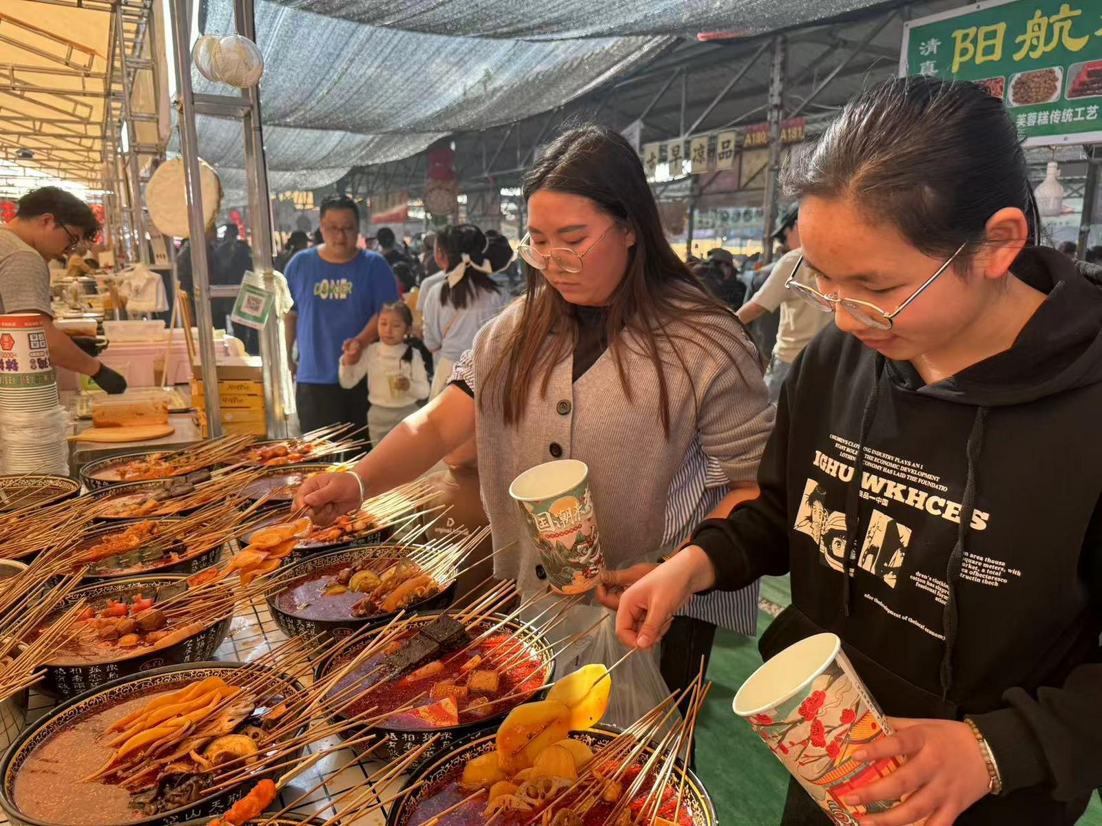 走进美食街,人声鼎沸、客流涌动,各类特色摊位前人头攒动、络绎不绝,处处洋溢着新春的热闹与烟火气息。街区内,传统本土美味、民族特色小吃与网红潮流美食“三足鼎立”,形成差异化消费特色,全面满足不同游客的口味需求。“价格亲民、丰俭由人”是本次美食街的特点,从几元钱的特色串串到几十元的新鲜牛羊肉,多样价格区间覆盖各消费群体,有效带动“高频次、多品类”的消费模式,让游客既能吃得尽兴,又能消费无忧。