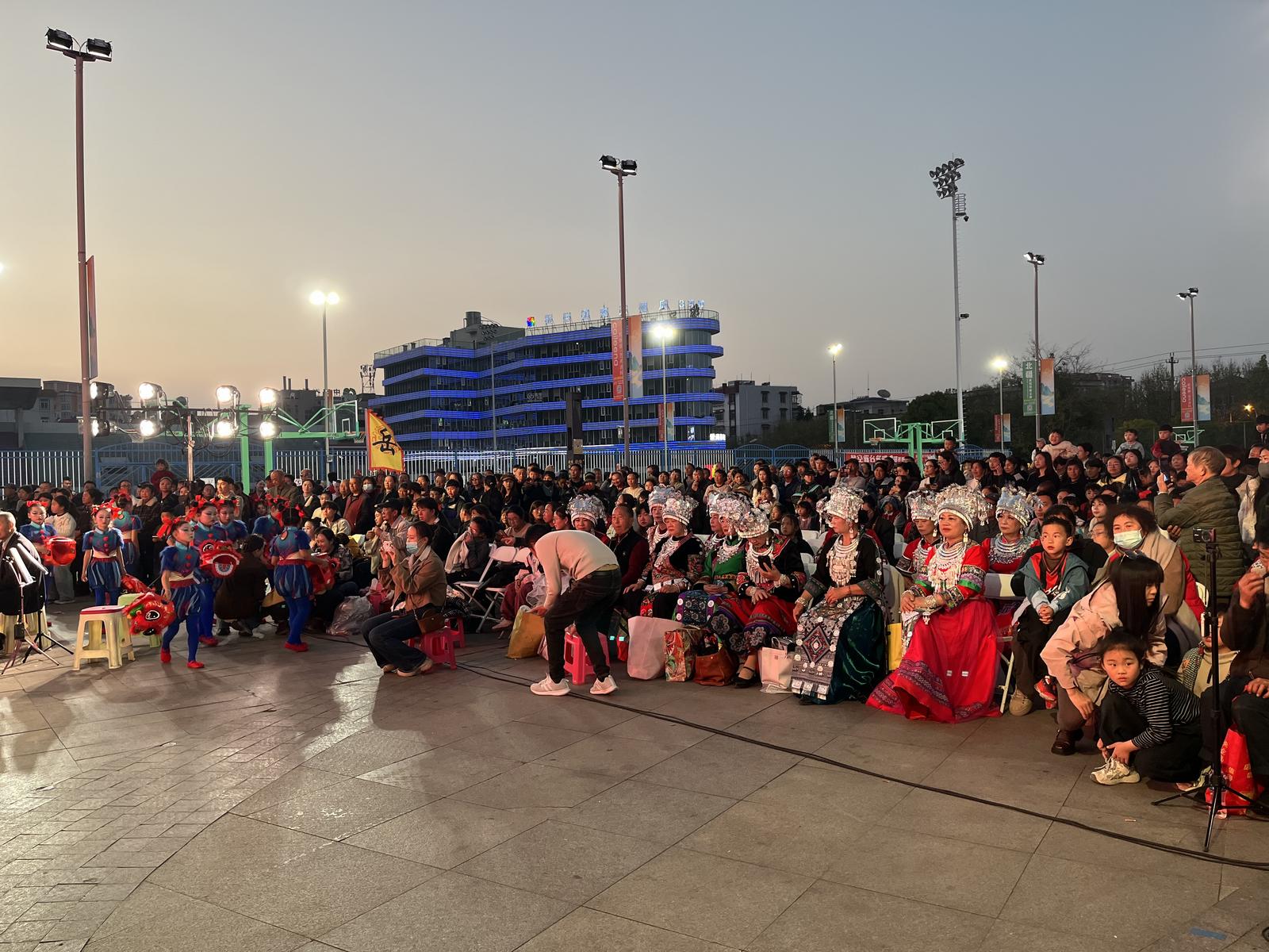 夜幕降临,体育场内灯光璀璨,热闹非凡。伴随着震撼激情的鼓点,演出在国风舞《江湖夜雨十年灯》中拉开帷幕。接着,优雅端庄的旗袍走秀《春风成蝶》、活泼灵动的少儿舞蹈《醒狮闹通海》、铿锵有力的朗诵《中国正青春》等15个节目轮番上演,涵盖舞蹈、朗诵、器乐等多种形式,充分展现了通海及周边地区群众的文艺风采。演出现场气氛热烈,观众热情高涨,大家纷纷举着手机记录精彩瞬间。