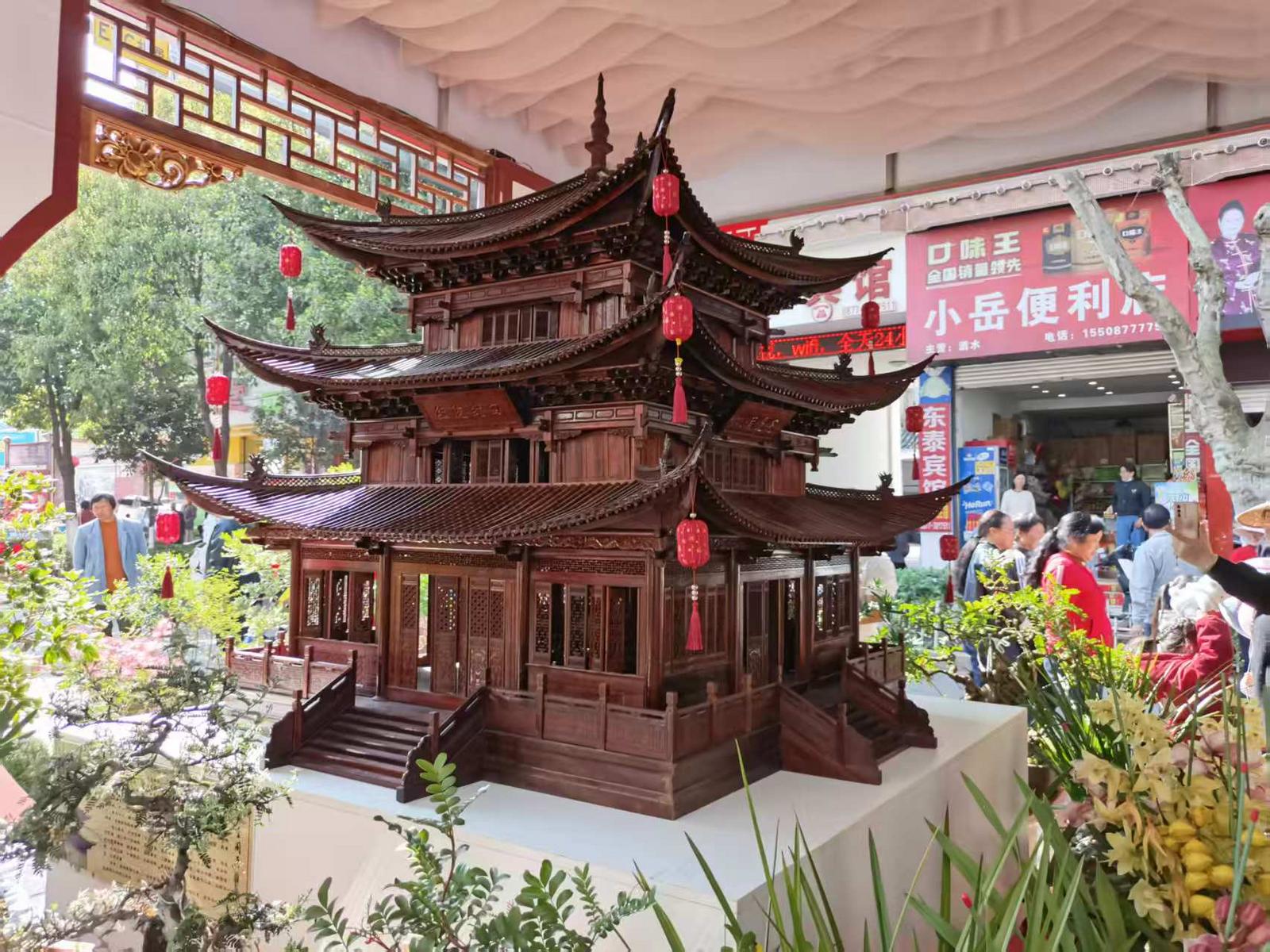 “我们这个模型它是参照我们地标性建筑聚奎阁来做的,这个模型有4000多个构件,五个人整整做了一年,我们这个模型完全是采用榫卯结构,它没有一颗钉子,随时都可以拆可以卸,这次花街拿出来展示,给各地方的,全国各地的人来看,展示我们通海古建筑的魅力。”云南天成木业有限公司总经理、云南省掌墨大师钱正伟说。