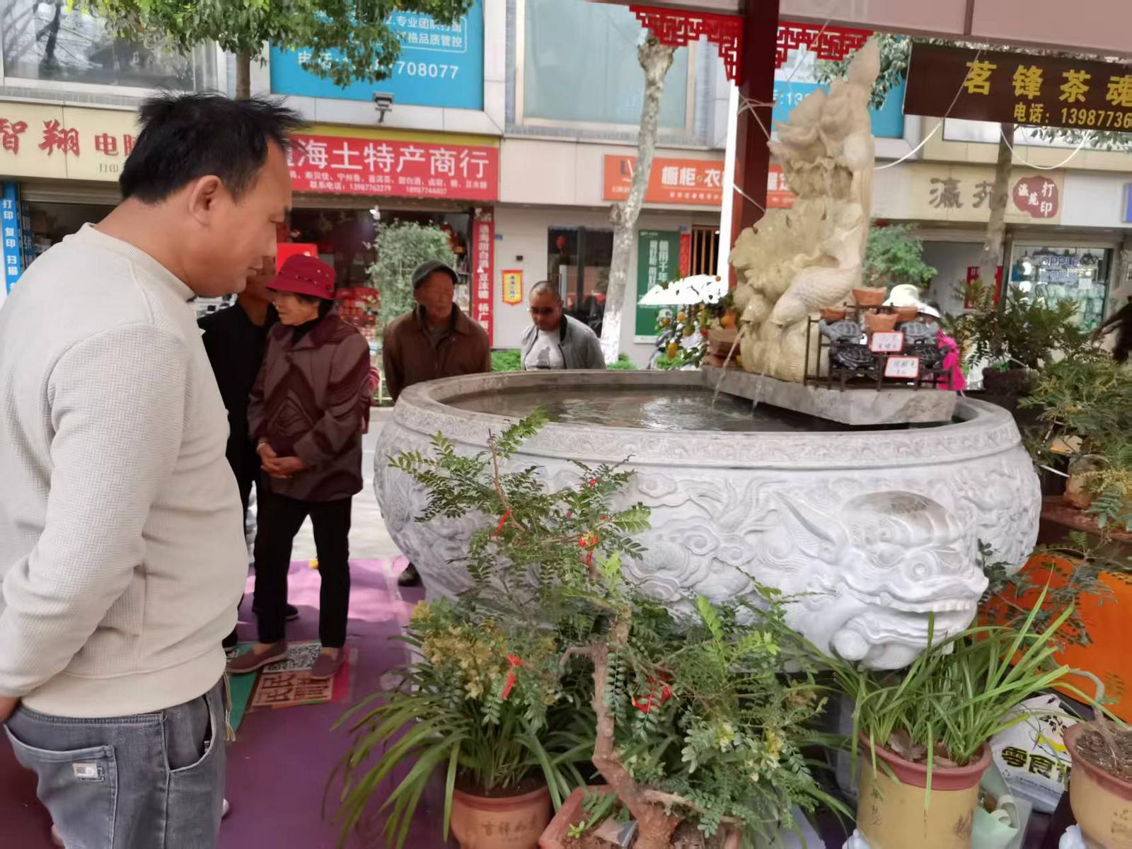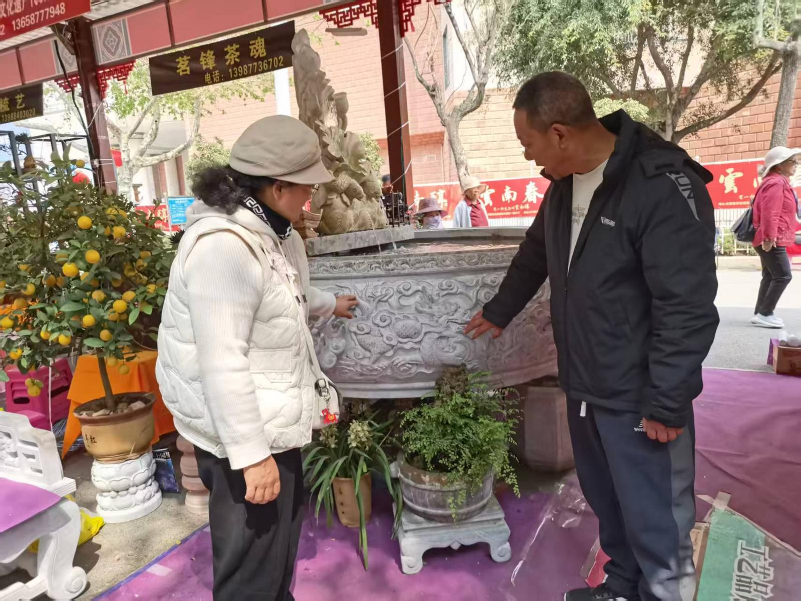 在鲁氏石坊展区,省级工艺大师、省级非遗传承代表人鲁永红带来的九龙大缸格外引人注目。这口专为本次花街精心创作的大缸,直径达2.8米、高68公分,周身雕刻的九条龙形态各异、蟠曲交错,严格沿用清代龙纹风格,刀工细腻流畅、纹路清晰灵动,彰显了鲁永红深厚的石雕功底和匠人本色,引得过往游客纷纷驻足称赞、拍照留念,近距离感受石雕技艺的独特魅力。