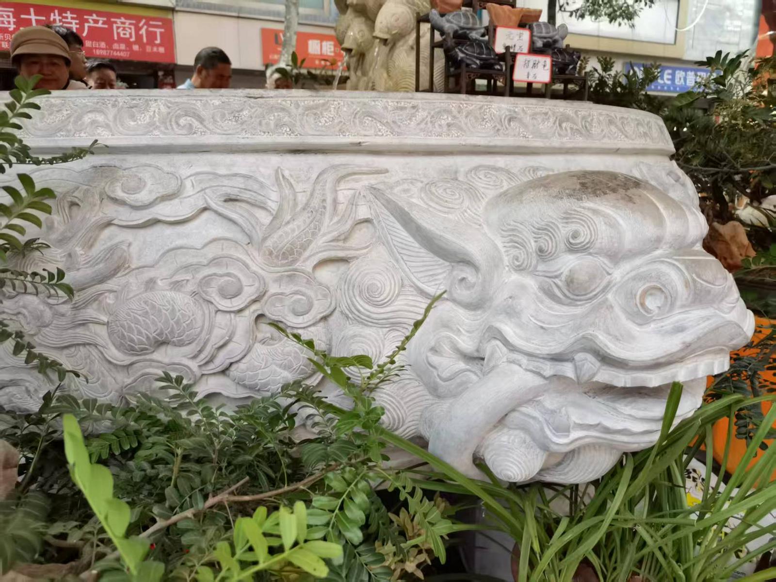 “我为这次花街创作了这口九龙大缸,我带领着我儿子和两个徒弟用时8个多月完成。我们本地这个造型是只雕龙头、龙身和龙尾,每条龙都是形态各异,不是重复的。”鲁氏石坊负责人、石雕传承人鲁永红说。