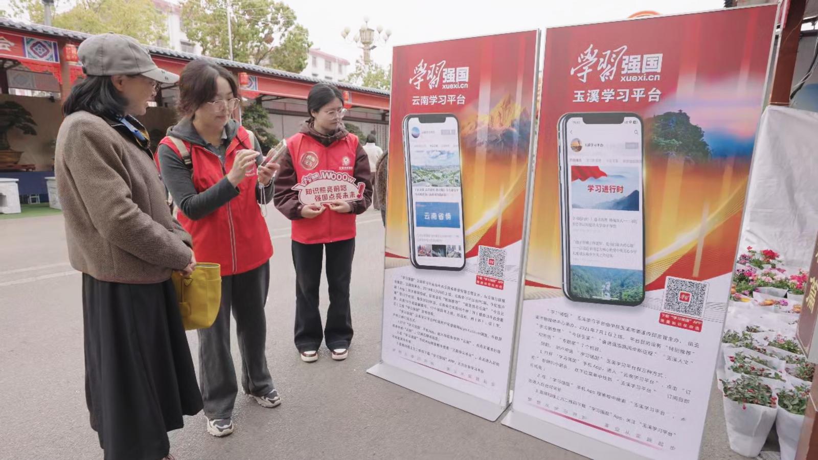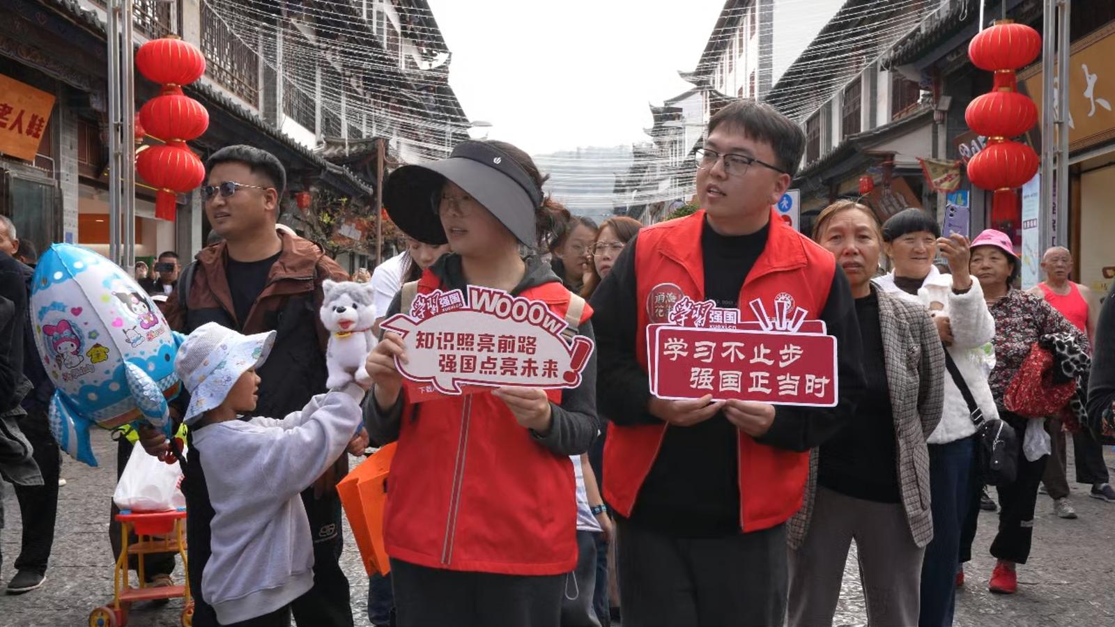 活动伊始,“花车巡游华服生辉”环节吸睛十足。以通海文化符号为核心打造的特色花车华丽登场,搭配汉服、马面裙等传统服饰的巡游队伍穿行街头,尽显中华服饰之美与本土文脉底蕴。志愿者沿途宣传“学习强国”平台,演示功能、指导操作,推动传统文化与现代知识双向传播。