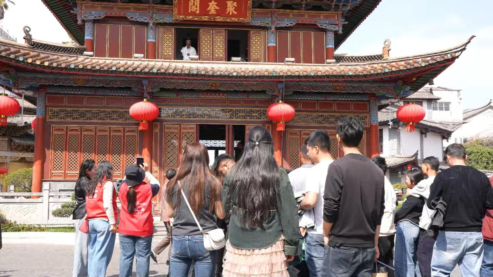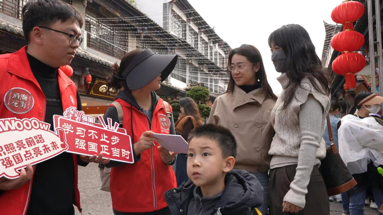 雅韵聚奎诗联迎春”“智闯文渊分享扩散”环节各具特色:志愿者身着古装,围绕通海“匾山联海”、古诗词等出具上联,群众踊跃对句赢文创;花街入口的“学习强国”专区,群众通过答题、合影分享领取文创,轻松传递知识、扩大活动影响力。
