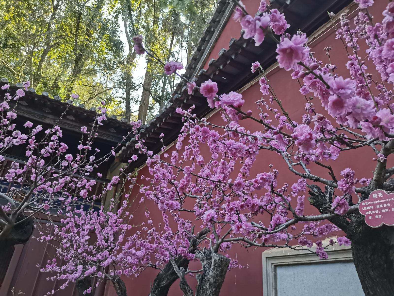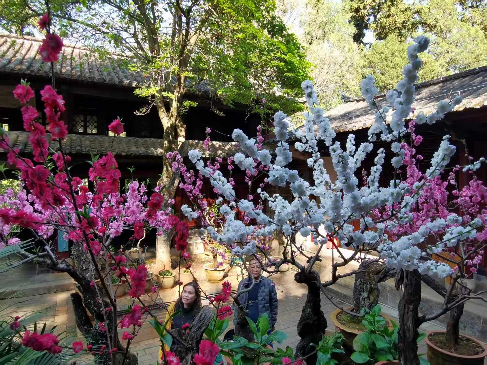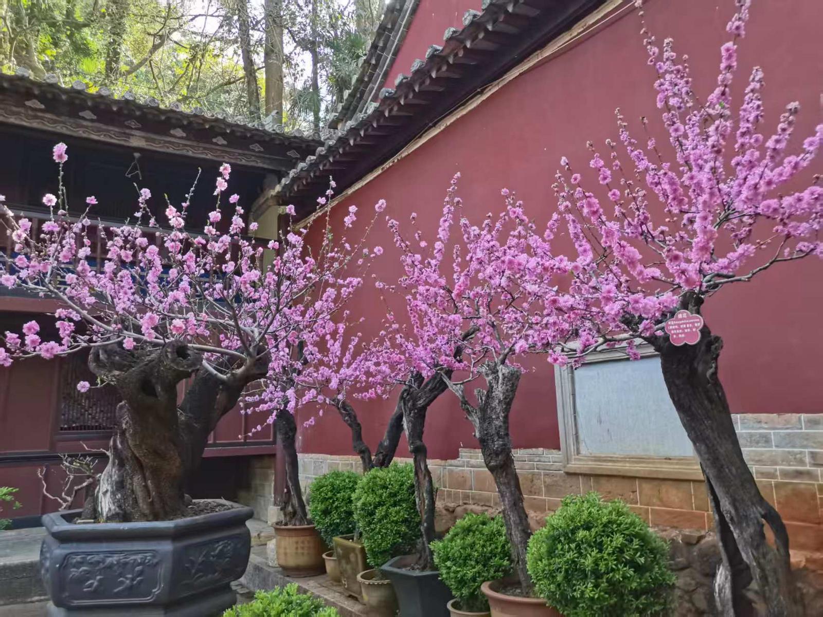 走进秀山公园玉皇阁,古朴典雅的古建筑与烂漫桃花相映成趣,一盆盆造型苍劲的桃桩枯木逢春、花枝满梢,宫粉、朱红、白碧桃、粉碧桃、牡丹桃、胭脂红6个品种的桃花次第吐蕊。红的热烈似火,粉的娇嫩温婉,白的素雅清新,一朵朵、一簇簇缀满枝头,映衬着红墙黛瓦,在春风中轻轻摇曳,暗香浮动,将千年秀山装点得春意盎然、诗意浓浓。