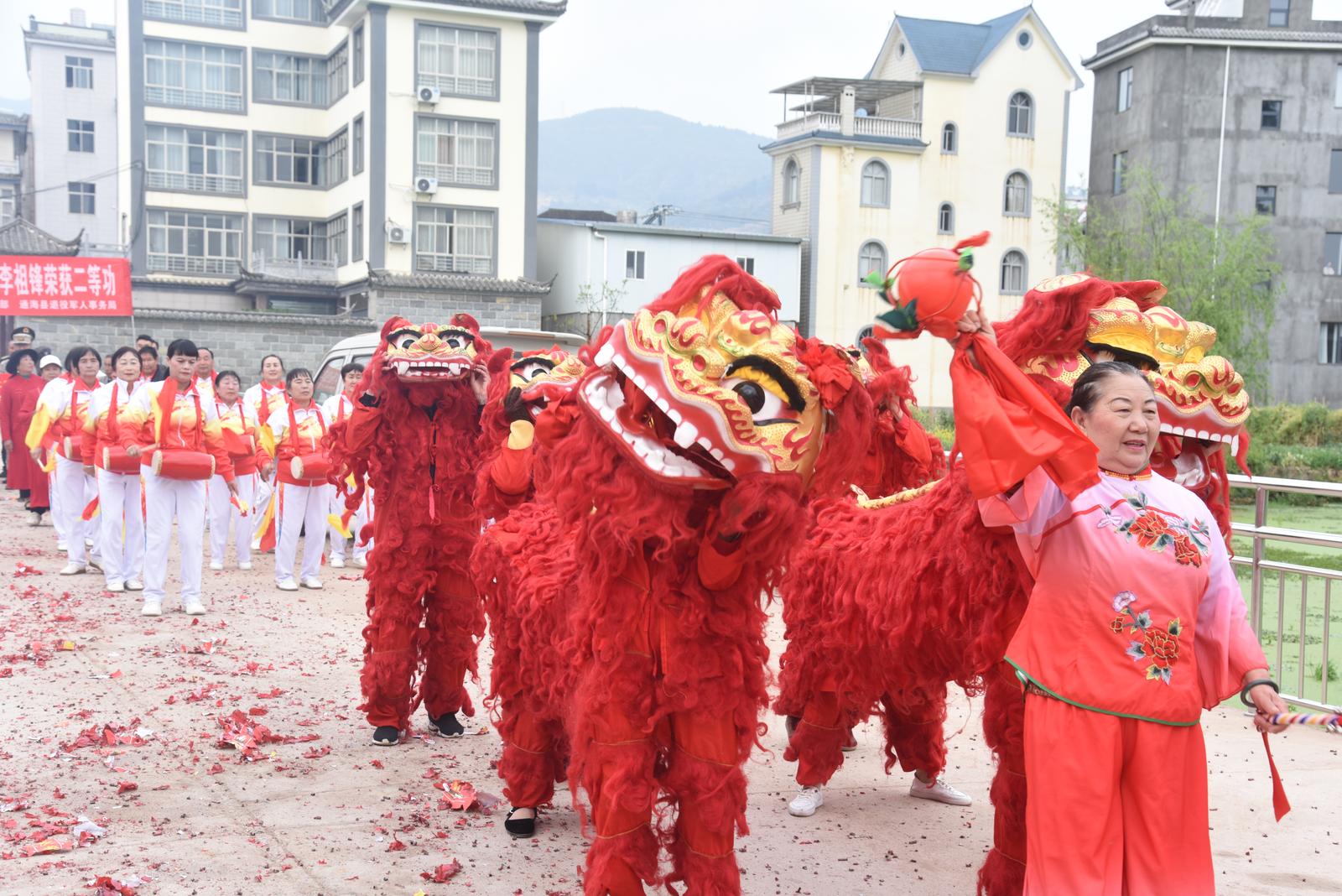 当天的螺髻村热闹非凡,喜庆的锣鼓声、清脆的鞭炮声此起彼伏,舞狮队昂首腾跃,腰鼓队铿锵起舞,闻讯而来的邻里乡亲纷纷驻足围观、拍手道贺,共同见证这属于军人家庭的荣耀时刻。
